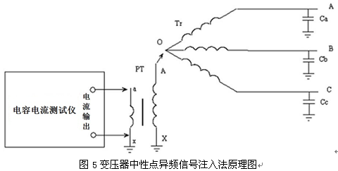 變壓器中性點(diǎn)異頻信號注入法測量原理如見圖5。